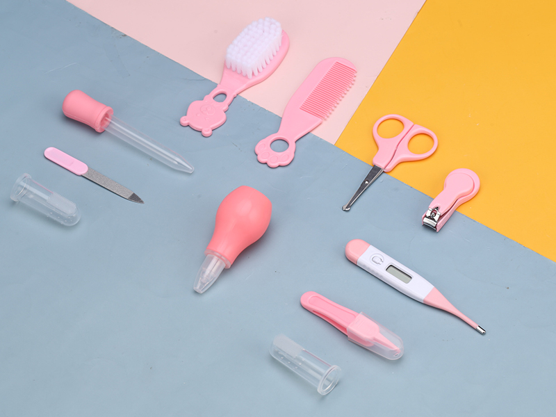 Nail clipper, nail scissors, nail file, finger toothbrush, medicine drop feeder, nasal aspirator, tweezers, thermometer, comb, head brush